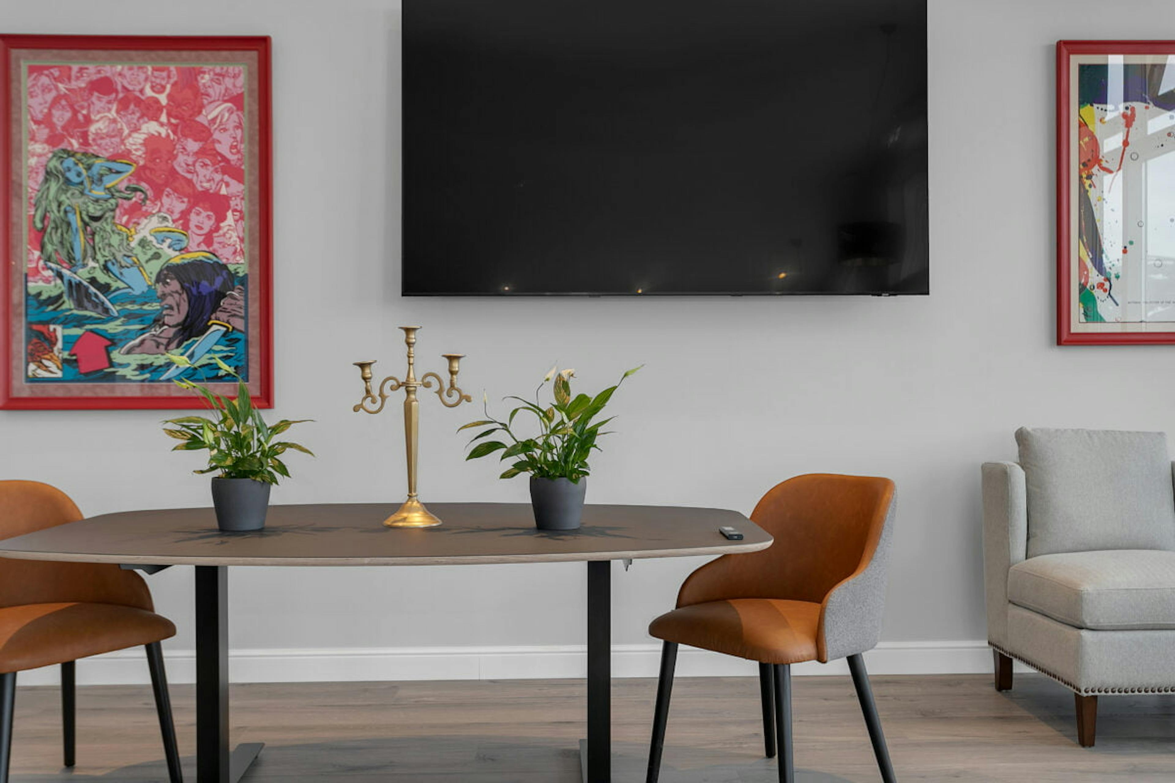 Experience modern convenience with top-notch equipment including a high-quality projector, expansive screen, reliable Wi-Fi, a handy flip chart, and an impressive sound system. All these tools are at your disposal, ensuring your presentations are seamless and interactive.